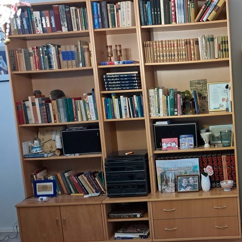 Tilava kirjahylly, ŕeunat käsitelty tummaksi