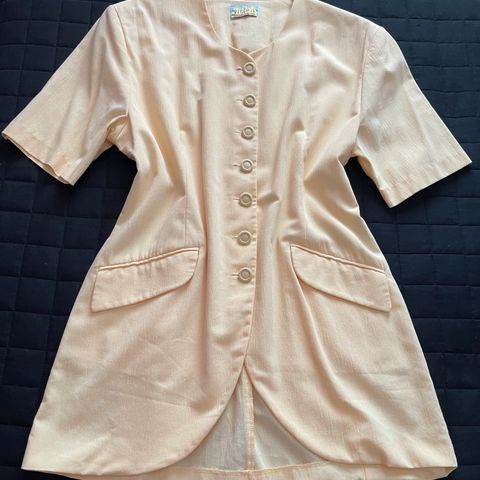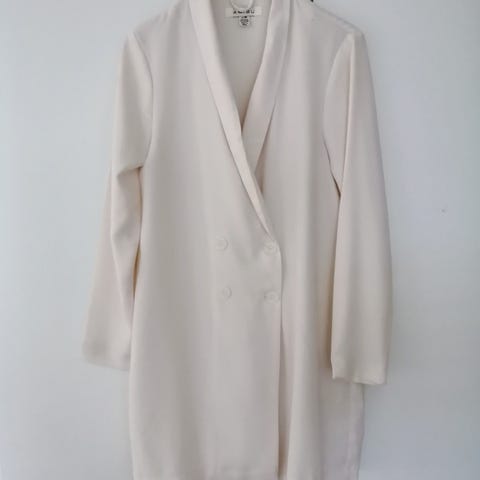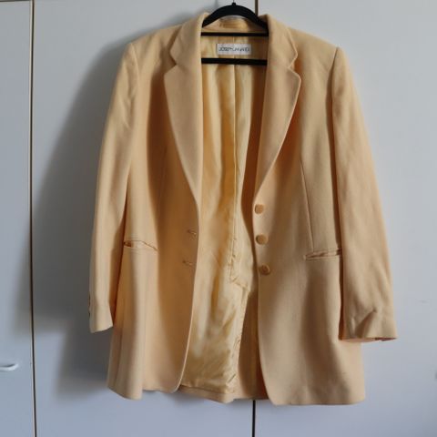 Martinelli naisten takki, koko S. Pitkä, suoralinjainen malli, jossa V-pääntie ja nappikiinnitys edessä. Väri on vaalea keltainen. Materiaali polyesteriä. Pitkät hihat ja halkiot helmassa lisäävät liikkumavaraa. Sopii käytettäväksi esimerkiksi kevyenä sisätakkina tai siistinä päällystakkina leudommilla säillä. Kauppaan kuuluu myös asusteen 2 vuorillista hametta, koko 36 ja 38.