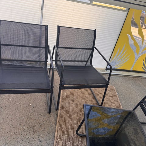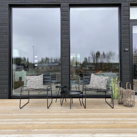 Terassituoli, jossa on harmaa metallirunko ja säkeistä koostuva istuin-ja selkäosa. Käsinojat ja runko ovat suoraviivaiset, ja istuin- sekä selkänojaosat koostuvat useista vaakasuuntaisista säleistä. Huom!Yhden tuolin istuinosan poikkisäle on poikki.