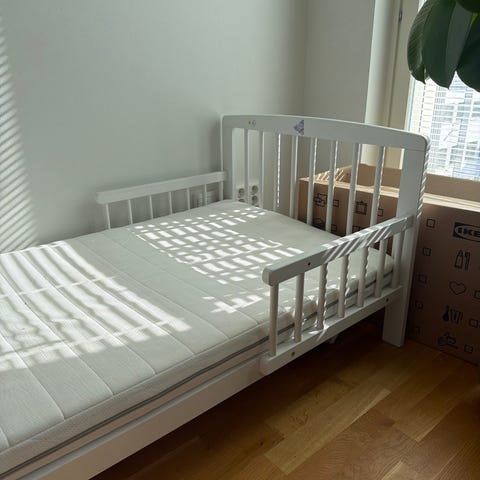 IKEA juniorisänky, jossa puinen sälepohja. Sängyn runko on suunniteltu lapselle, ja siinä on laidat molemmilla sivuilla. Materiaalina on puu sekä maalattu runko-osa. Sopii lapsen ensimmäiseksi omaksi sängyksi pinnasängyn jälkeen. Patja ei sisälly kuvaan perustuen tiedossa oleviin tietoihin.