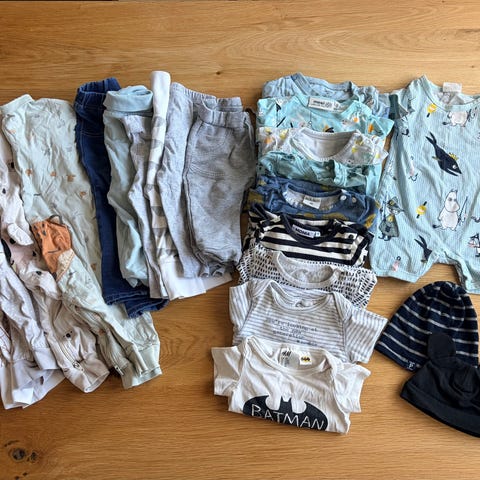 Pakettiin kuuluu neljä pitkähihaista bodya, yksi lyhythihainen body ja kahdet housut. Vaaleanpunaisessa Metsolan ribbibodyssa kokomerkintä 68, mutta menee mielestäni pienemmässä koossa jo. Punainen body (62/68) on vanhemmasta äitiyspakkauksesta ja siinä on haarassa tuplanepparit ja väri jo jonkin verran haalistunut. Raitabody on kietaisumallinen ja Minni-body paitamallinen. KappAhlin vaaleanpunainen body on lyhythihainen. Molon kukkahousuissa (isot kukat) värit säilyneet hyvin. Toisissa housuissa kokomerkintä peräti 80, mutta ovat mielestäni reilusti pienemmät ja siksi tässä paketissa mukana. Niissä housuissa polvissa kulumisen merkkejä, kts. kuvat.