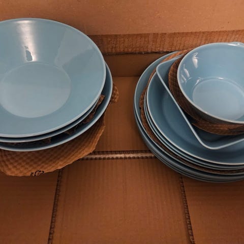Laatikollinen sekalaisia astioita. Myydään ensisijaisesti koko setti kerralla.