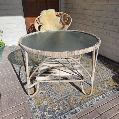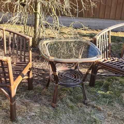80-luvulta peräisin oleva sohva, kaksi tuolia ja lasipöytä uuteen kotiin. Päällisissä jo haalistumaa, mutta haalistuneet niin tasaisesti että ei ole meillä häirinnyt. Rottinkikalusteet pääosin ehjiä, toki joitain iän tuomia feeluja löytyy. Lasikansi kaipaisi alleen imukuppeja, ne ovat ajan saatossa irronneet johonkin
