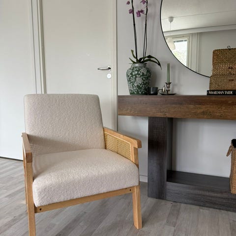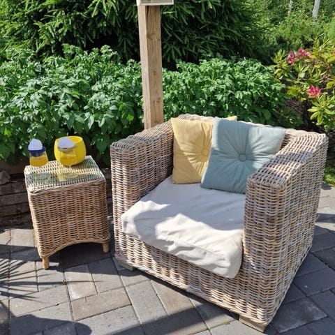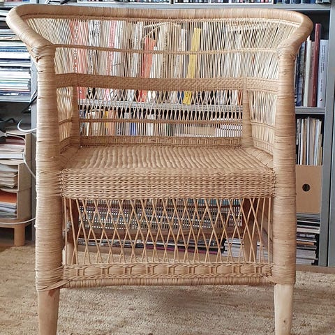 Aldorassa on kaunis aidosta rottinkista valmistettu nojatuoli pehmeillä linjoilla, taidolla käsin kudottu.