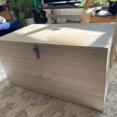 Puinen ruskea arkkupöytä, vaikka sohvapöydäksi.