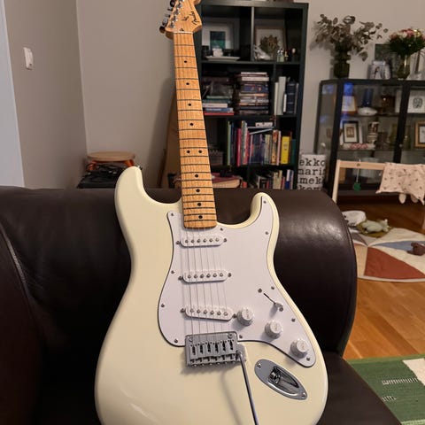 Tästä loistava 50s strato hieman tuhdimmalla kaulalla! Värinä White Blonde. Lollar Special mikit kiinni ja orkkis 59 -setti mukaan. Nauhoja hyvin jäljellä ja juuri säädetty huollossa 10-48 setille. Pientä normaalia kulumaa pinnassa, mutta ei mitään isoa. Ei mikkien lisäksi muita modauksia.