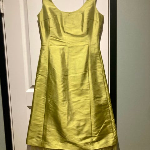 Suomessa valmistettu by Marja silkkinen juhlamekko. Väri petrooli/vihertävä. Kaunis himmeä kiilto, jonka silkki saa aikaan. Kokolapussa M, mutta mielestäni koko ennemmin reilu S. Takana vetoketju.