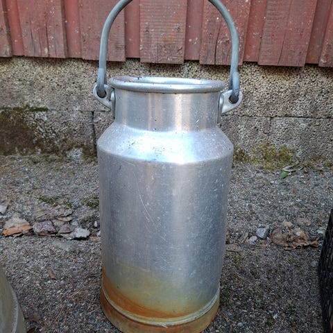 Alumiininen maitotonkka, tilavuus 40 litraa. Kannessa lukitusketju ja kahvat sivuilla kantamista varten. Soveltuu esimerkiksi koriste- tai varastokäyttöön. Nouto