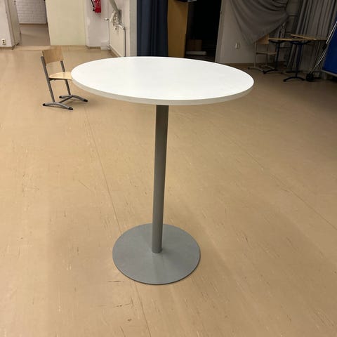 Ikea Billsta baaripöytä, jossa pyöreä valkoinen pöytälevy ja harmaa metallijalka ristikkojalustalla. Pöydän korkeus on 104cm. Pöydän halkaisija on 70 senttimetriä