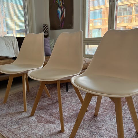 Täältä torista ostetut ruokapöydän tuolit, jotka ei mahdukkaan meidän pödän ääreen järkevästi.