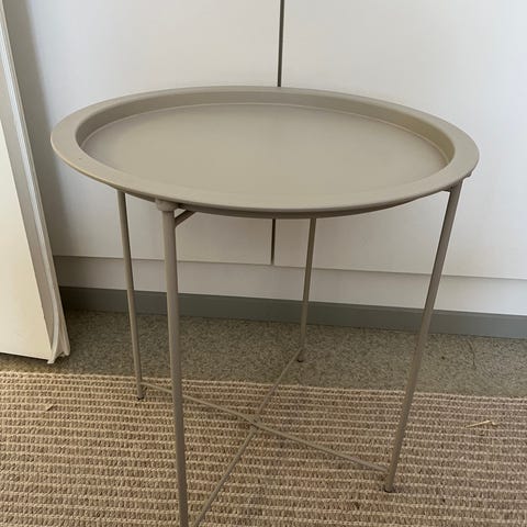 Ikean musta Gladom-tarjotinpöytä. Siisti ja hyväkuntoinen; tarjottimessa pari himmeää naarmua, jotka erottaa lähinnä oikeassa valossa. Nouto Etelä-Haagasta Helsingistä.