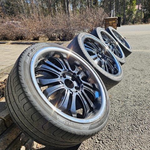 Siittä jollekki hyvät vanteet renkailla, takana kusiuuet renkaat laputki vielä kiini, eessä yhen kesän ajetut pintaa on. Etu renkaat 235/35/20