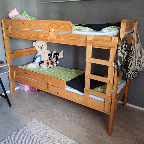 Käytöstä poistuva kerrossänky. Vankka, mallia IKEA. Käytönjälkiä on jo. Nopeasti pois. Ei sisällä patjaa.