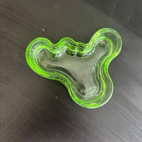 Iittala Aalto lasimaljakko / tuikkukippo / kynttilälyhty, kaksi kappaletta. Toisessa maljakossa vihreä sävy ja Iittalan punainen logotarra, toinen tummanharmaa tai lähes musta. Muoto tyypillinen Aalto-sarjan orgaaninen aaltoileva muoto. Virheetön kunto.