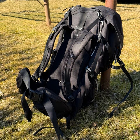 Selkäosa on säädettävä eripituisille retkeilijöille, olkaimissa rintaremmi ja tukeva lantiovyö. Sisäosa erittäin siistissä kunnossa.