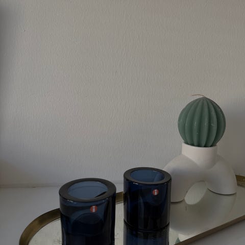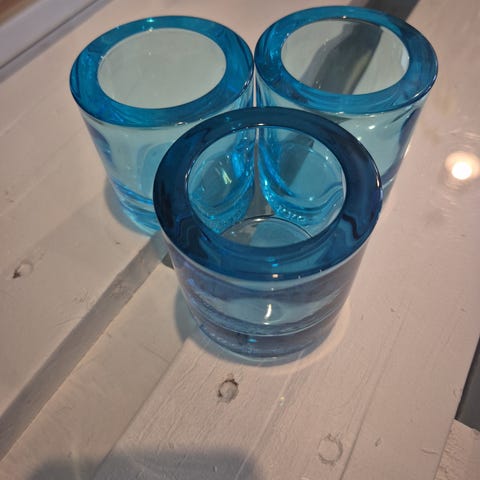 Iittala Marimekko Kivi lasiset tuikkukipot, yksi kirkas ja yksi sininen. Molemmat ovat paksua lasia ja sylinterin muotoisia. Sopivat tavallisten tuikkukynttilöiden polttamiseen ja esimerkiksi pöydän tai ikkunalaudan tunnelmavaloiksi. Marimekko-kaiverrus pohjassa kertoo valmistajasta. Virheetön kunto.