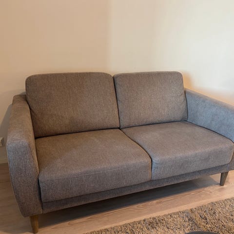 Kahden istuttava noin 160cm pitkä sohva. Istuimet valkoiset, mutta joitakin tahroja.