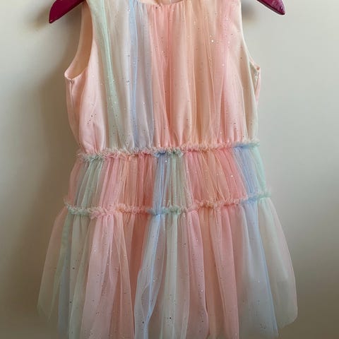 Myydään kaunis liehuvahelmainen tyttöjen juhlamekko, jossa on paljetteja ja tylliä. Mekko on ollut käytössä pari kertaa ja kuin uusi. Edessä paljeteilla koristeltu perhoskuvio ja paljettikoristeita löytyy myös helmasta. Koko 116 cm. Ihana mekko pikkuprinsessalle kevään ja kesän juhliin.