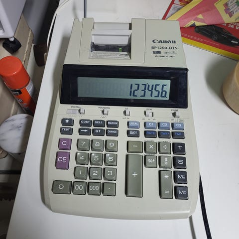 Canon AS-120 musta pöytälaskin. Laskimessa on suuri, kallistettu näyttö ja kookkaat näppäimet helpottamaan käyttöä.
