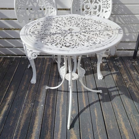 Terassikalustesetti, johon kuuluu pyöreä pöytä ja kaksi tuolia. Pöydässä on metallirunko ja puinen, ruskeaksi käsitelty rimakansi. Tuoleissa on metallirunko ja puiset istuin- ja selkänojarimat. Sopii parvekkeelle tai terassille ulkokäyttöön. Pöydän halkaisija 60 cm. Puuosat öljytty viime kesänä, metalliosissa kulumaa ja käytön jälkiä. Talven jäljiltä kaipaavat pesua.