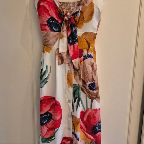 Moves Minimum kukkamekko koko 38. Ihana kauniisti laskeutuva malli. Mekossa on pitkähelmainen malli ja pitkät hihat. Kuosina on kirjava, pienikuvioinen kukkaprintti. Mekossa on vyötäröä korostava leikkaus ja samaa kangasta oleva vyö. Sopii arkeen ja vapaa-aikaan lämpimiin säihin tai kerrospukeutumiseen viileämmällä säällä.