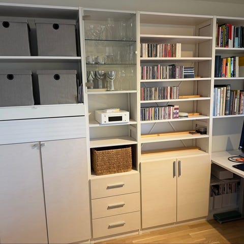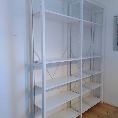 Korkeus 207cm, leveys 93cm per puolikas hyllykkö = yhteensä 186cm ja syvyys 25cm lyhyemmät tasot ja 40cm pidemmät tasot.