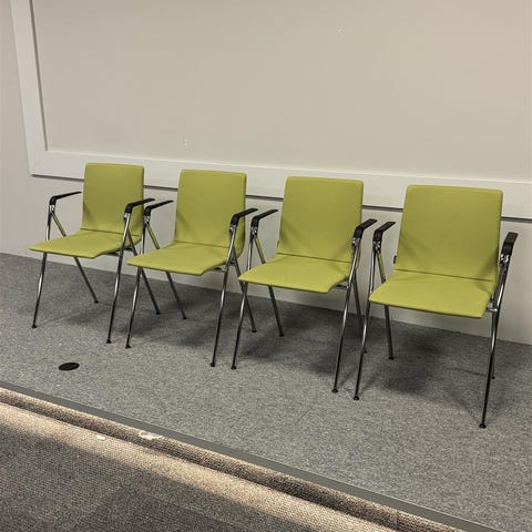 Inno Lab Y + C toimistotuolit, joissa on pyörät alla, kangasverhoiltu mukava istuinosa ja käsinojat. Tuolit ovat vaaleansiniset ja niissä on mustat metalliset jalat.