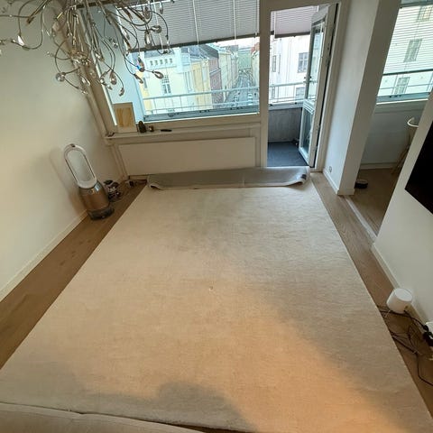 Layered matto, orgaanisen muotoinen ja yksivärinen vaaleanvihreä. Materiaali villaa. Matto on solmittu eripituisista villakuiduista, siten että matto on keskeltä hiukan korkeampi kuin reunaosiltaan. Matossa kiertää kaunis "syvennys" reunoilla.