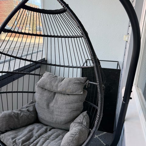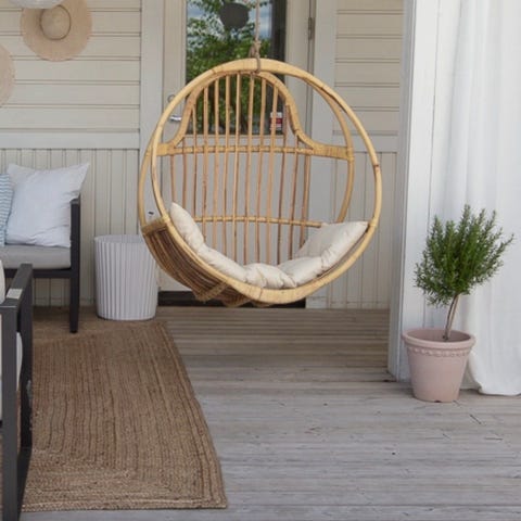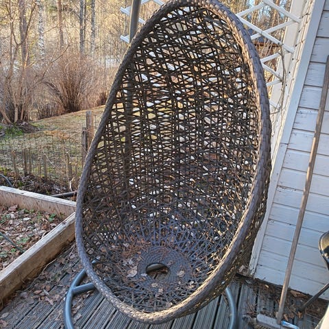 Iso riipputuoli, kokonaiskorkeus 203cm, korin leveys 133cm. Kori ja jalka ehjät, pehmusteet haalistuneet auringossa. Nouto Palokka.