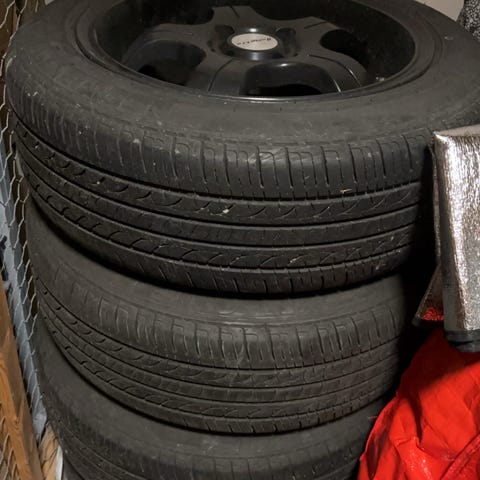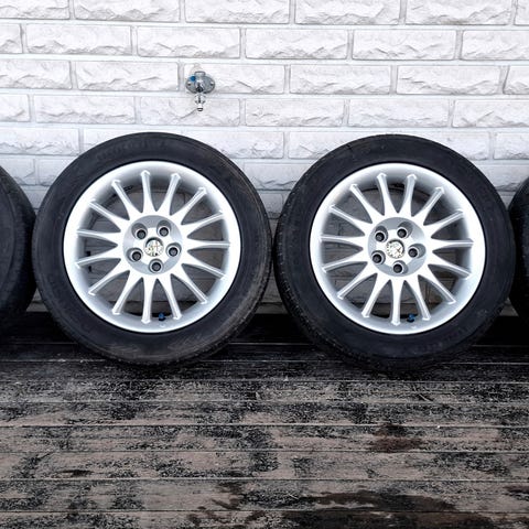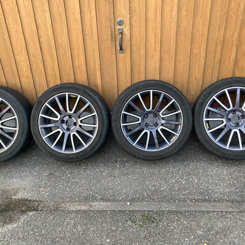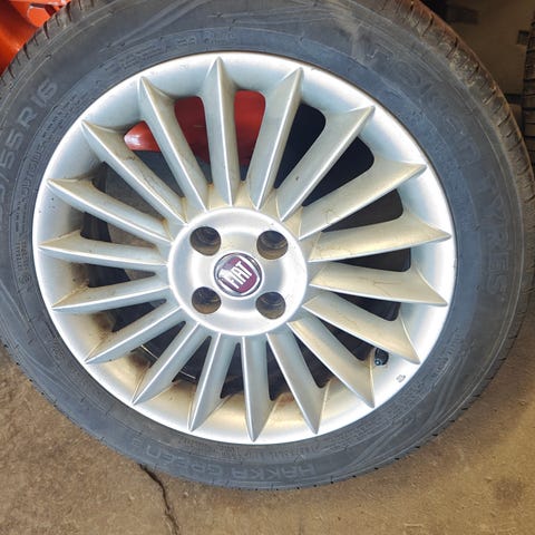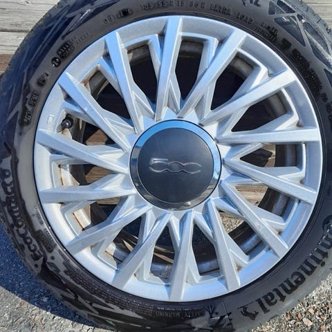 Abarth 595 alla olleet Hankook Ventus 195/45/16 kesärenkaat Dotz 6 1/2 x 16 vanteilla isompien tieltä. Molemmat hyvä kuntoiset, kulutus pintaa n.5,5mm
