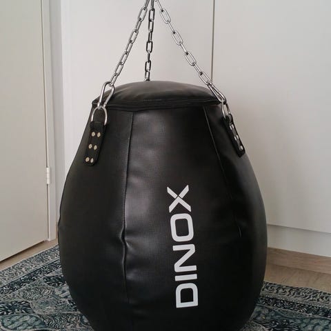 Vähän käytetty nyrkkeilytyyny jonka saa kiinnitettyä seinään. Tyynyn sisus on edelleen jämäkkä ja sen saa vetoketjulla avattua.
