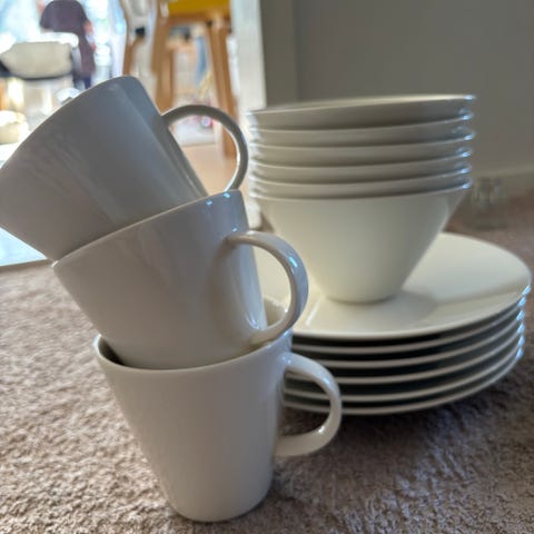 Arabia KoKo astiastosetti, jossa 3kpl kulhoja, 4kpl matalia lautasia, joissa yhdessä särö (ilmainen) ja 4 kpl suuria matalia lautasia.