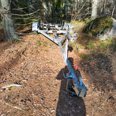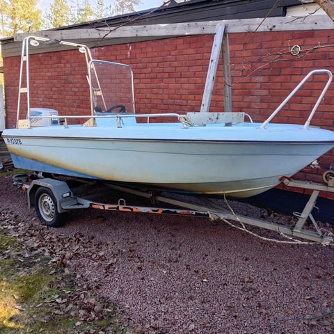 Kunnostusta vaativa lasikuitu vene rosterikehillä, vaatii kunnostusta tai varaosiksi. Volvon moottorilla. Rantatraileri kuuluu kauppaan.