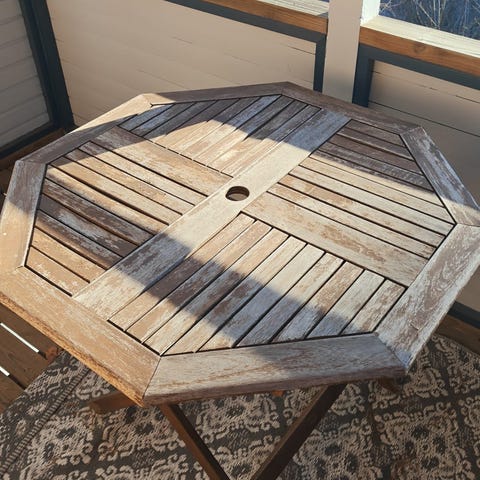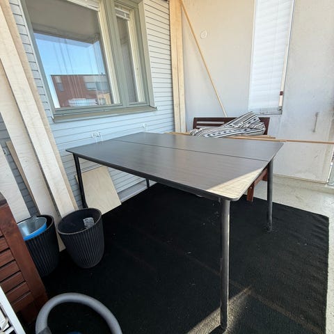 Puinen ulkopöytä, jota sävytetty ruskealla kalustemaalilla hieman alkuperäistä tummemmaksi. Ostettu aikoinaan Prismasta. Kannen pituus 150cm, leveys 85cm. Kulumaa löytyy, mutta voisi toimia hyvin esim. extrapöytänä liinan kanssa kevään juhlissa. Pöytä taittuu kasaan, jolloin leveys jalkojen kanssa 110cm.