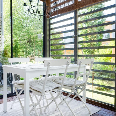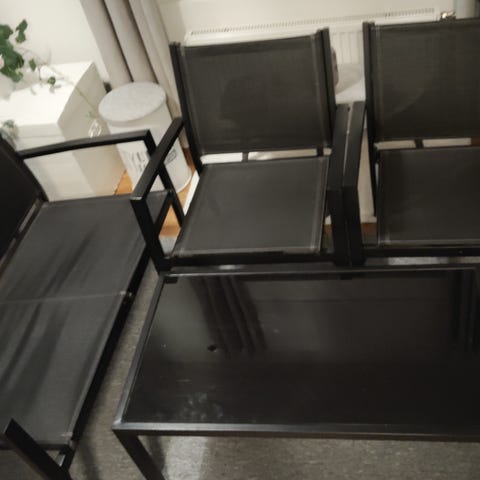 Tuolit ja pöytä painavat, ei lähde kovin helpolla tuulen mukana. Tuolit saa pinottua.