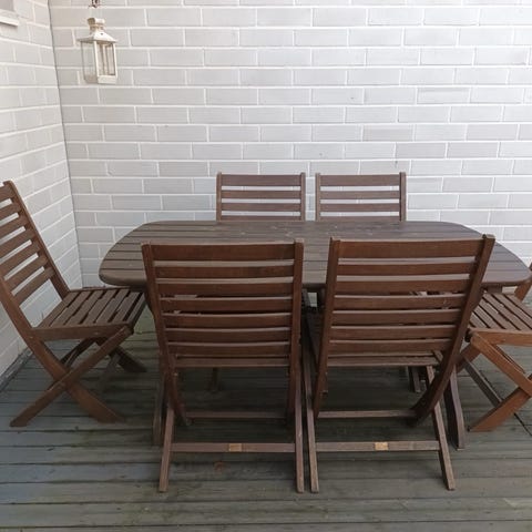 Myydään 6 hengen ruokailuryhmä terassille. Kaikki ehjää, mutta puupinnat vaatii uuden hionnan ja öljyämisen.