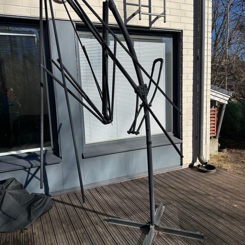 Annetaan tilanpuutteen vuoksi musta verkkokankainen aurinkotuoli metallirungolla. Ajan patinaa havaittavissa (vähän ruostetta metallirungossa), mutta kangas ok ja tuoli soveltuu silti edelleen erinomaisesti parvekkeella/terassilla makoiluun!