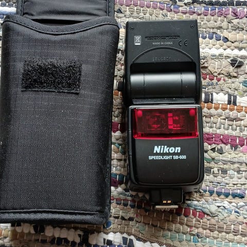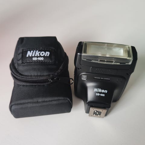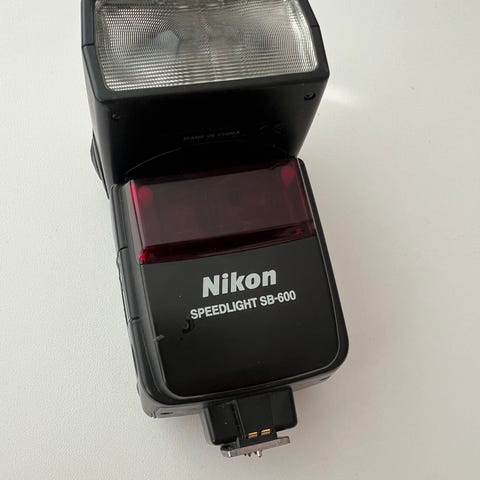 Nikon SB-26 kameran salama. Takana suuri LCD-näyttö ja painikkeet zoomin, tilojen ja asetusten säätöön.