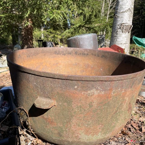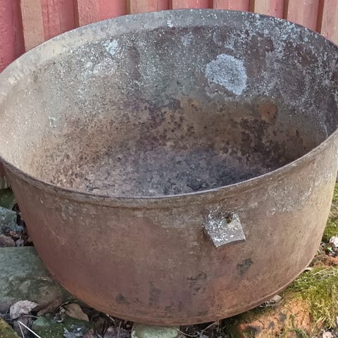 Iso rautapata jalalla, halkaisija 59cm ja korkeus 30cm, pohja ehjä ei reikiä, hyväkuntoinen.