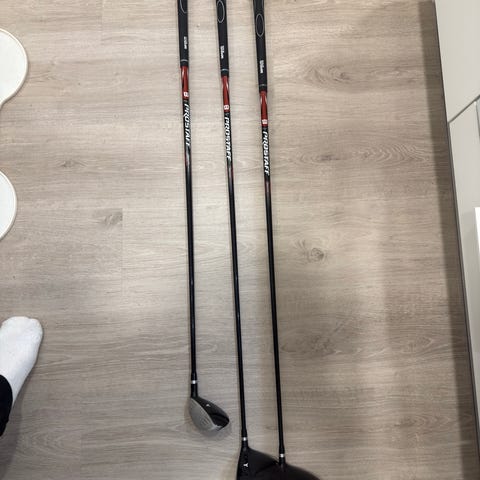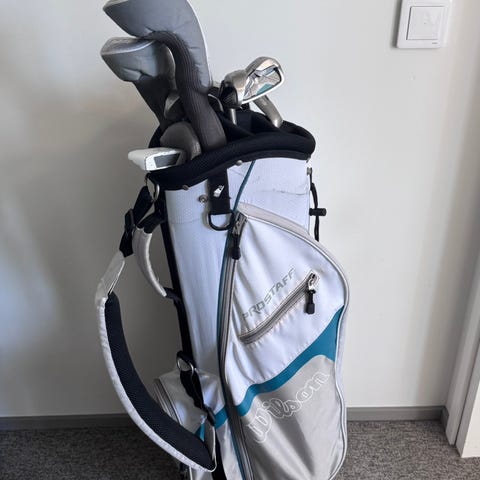 Wilson Prostaff SGi right golfmailasetti. Settiin kuuluu SW, PW, i9, i8, i7, hybridi, väyläpuu5, driver sekä putteri. Mailoissa on valkoiset varret ja harmaat gripit. Mukana bägi ja siihen sadehuppu.