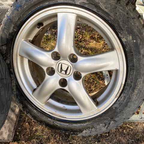 Kesärenkaat päällä. Kannattaa uusia, kun yksi kpl vuotaakin. Kolhittu on kanttareihin, kuvassa pahin jälki.