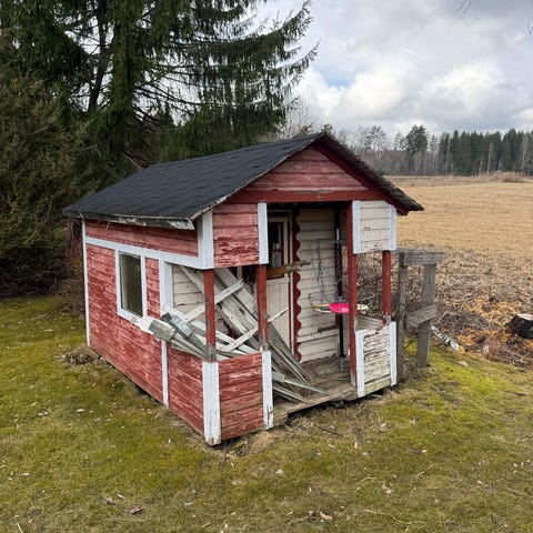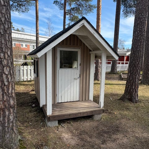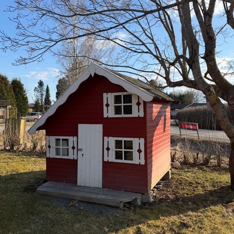 Puinen leikkimökki, jossa on kuisti ja kaiteet. Ulkoverhous on maalattu keltaiseksi valkoisin nurkka- ja ikkunalaudoin. Mökissä on ikkunoita usealla seinällä ja yksiosainen ovi ikkunaruuduilla. Sisäpuoli on paneloitu puulla ja lattia on puuta. Rakennus soveltuu pihaleikkimökiksi tai pieneksi piharakennukseksi säilytykseen tai oleskeluun käyttäjän tarpeen mukaan.
