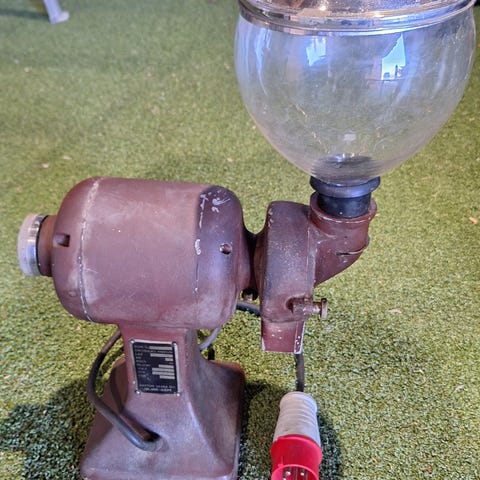 Peltiteos Oy sähköinen mylly. Rungossa on ruskea metallikuori ja erillinen metallinen säiliö yläosassa.Säiliö on jälkikäteen tehty ja ei ole ihan sopiva. Laitteessa on etupaneelissa säätönuppi, jossa on numeroitu asteikko. Sivuosassa on valmistajan kilpi, josta ilmenee teho 0,4 kW, jännite 220 V ja kierrosluku 1700 r/min. Laitteessa on verkkovirtajohto ja se on tarkoitettu kiinteälle pöytätasolle asetettavaksi.Sähköjohto on jokunen vuosi sitten uusittu.
