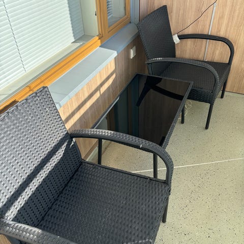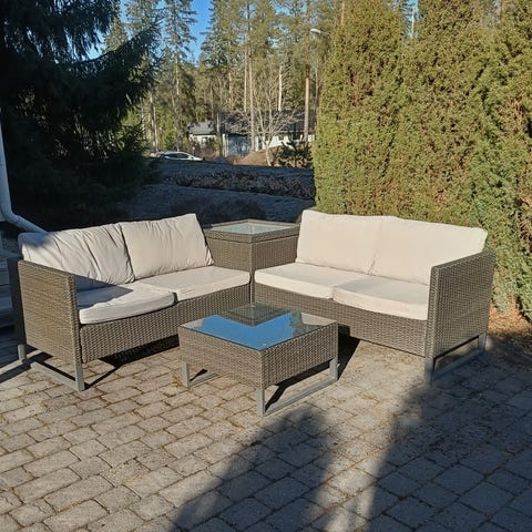 Myydään Polyrottinki divaanisohva ja sohvapöytä. Sohvapöydässä lasikansi. Divaanisohvan sohvatyynyt haalistuneet auringossa, muuten sohva ehjä ja hyvin kestänyt. Ollut katetulla terassilla. Divaanisohvan mitat: Sohvan kokonaisleveys 206cm Divaanin pituus seinästä 140cm istuinosan syvyys seinästä 74cm, istuinkorkeus 42,5. Pöydän leveys 64cmx64cm ja korkeus 31,5cm. Ostettu Askosta. Sohva koostuu 4 palasta, jotka on yhdistetty muovikiinnikkeillä toisiinsa sohvapalojen alapuolelta.