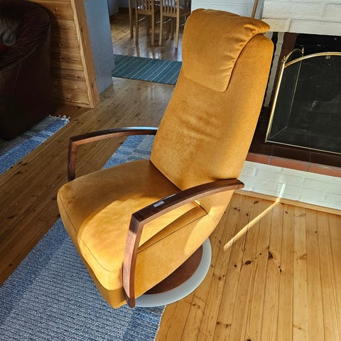 Nojatuoli rahilla. Suunnittelija Kirsi Valanti. Vaatii pesua ja kunnostusta. Haku tai kuljetuksesta voidaan sopia erikseen. Hinta 40€/ tarjous.