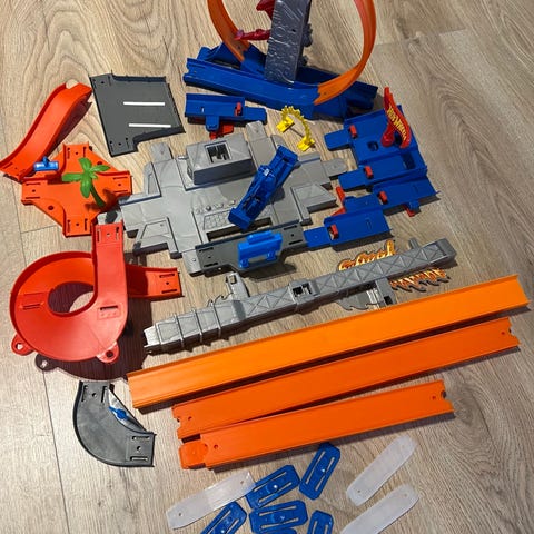 Hot Wheels Track Builder autoratapaketti, jossa oransseja ratapaloja, kaarrekappaleita ja laukaisinosia pienten metalliautojen ajattamiseen. Pakettiin kuuluu punainen kantokahvalla varustettu säilytyslaatikko, johon radan osat ja autot saa talteen. Mukana on ainakin yksi Hot Wheels -auto sekä kuvallinen ohje. Radan osia voi yhdistellä usealla tavalla ja liittää muihin yhteensopiviin Hot Wheels -ratoihin.