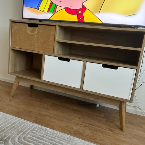 Uusi tv taso. Ollut käytössä muutaman kuukauden ajan. Ylä laatikko hieman jumissa. Ovh 120€. Saa tarjota.