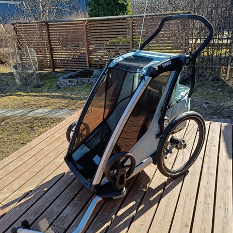 Suuret ilmakumirenkaat takana ja pieni etupyörä + työntöaisa työntökäyttöä varten. Vetopuomi kiinnikkeellä polkupyörään. Suojakankaana verkko-ovi sekä läpinäkyvä sadesuoja, jotka voidaan kiinnittää eteen. Takatilaan mahtuu hyvin tavaraa.