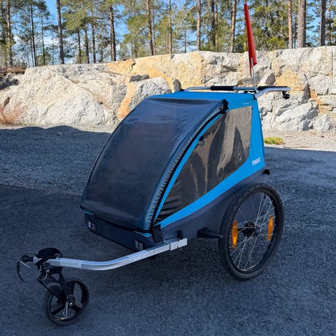 Thule Coaster XT pyöräkärry. Kärryssä on kaksi istuinpaikkaa viisipistevöillä, max. kuormitus 22kg per istuin, ikäsuositus +9kk.