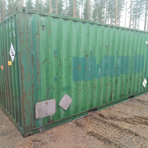 Huonossa kunnossa oleva työmaakoppi vaihtolavakiskoilla.